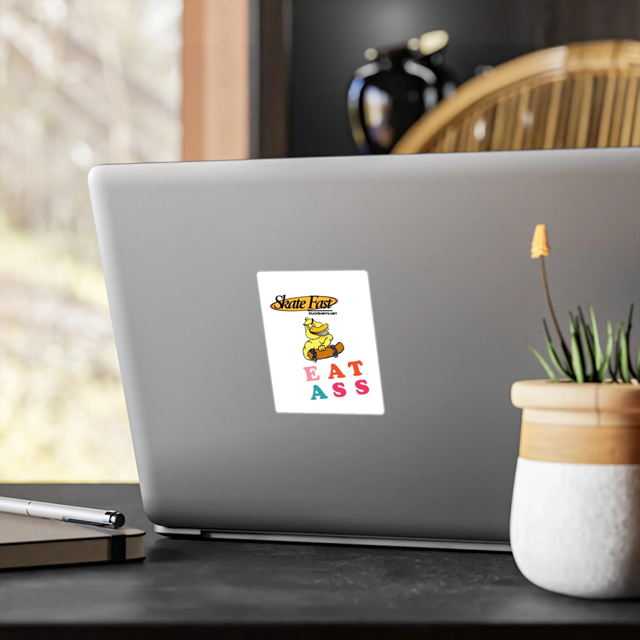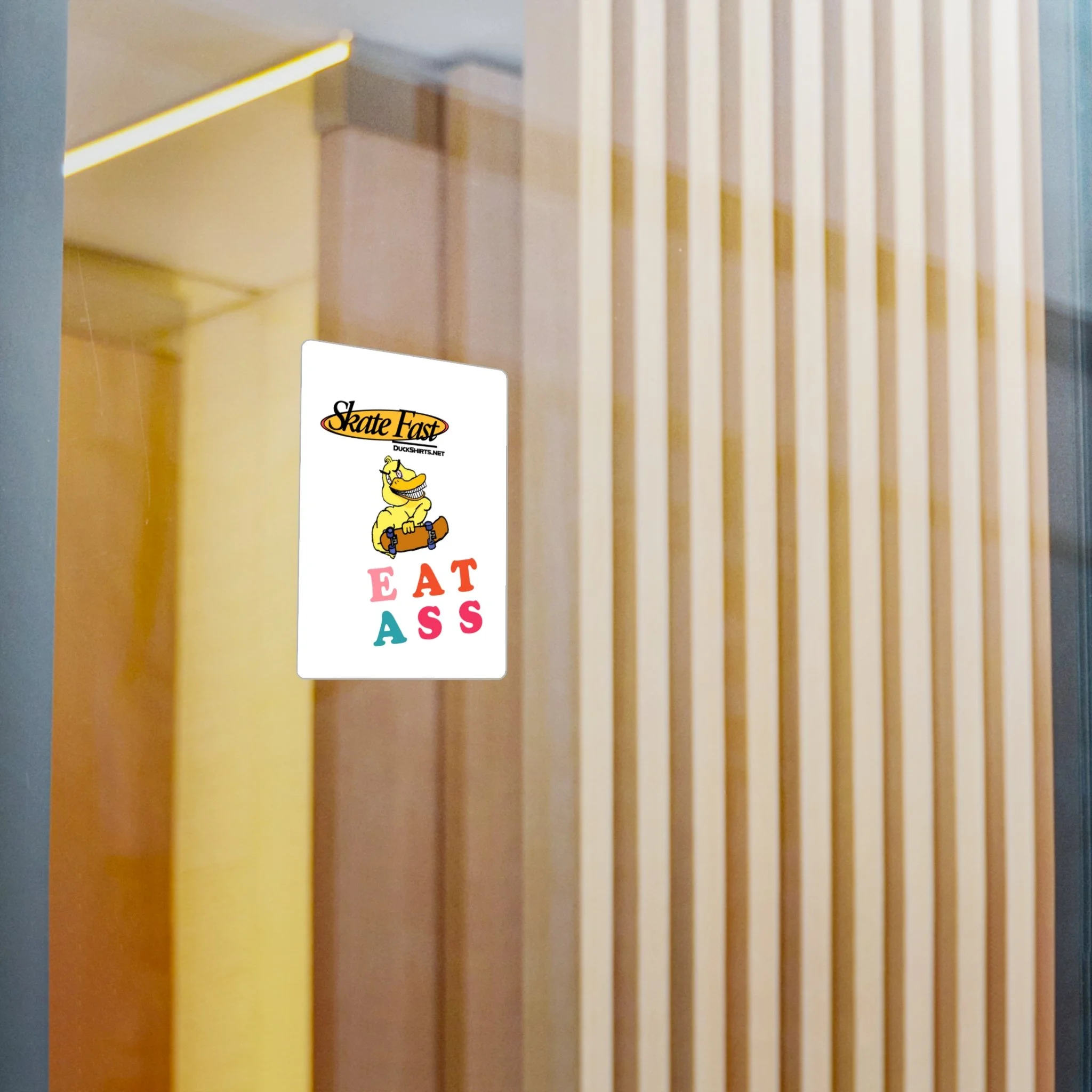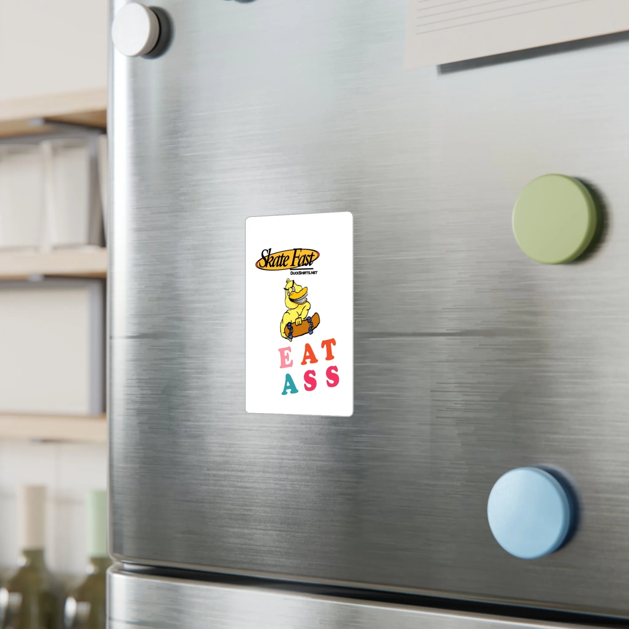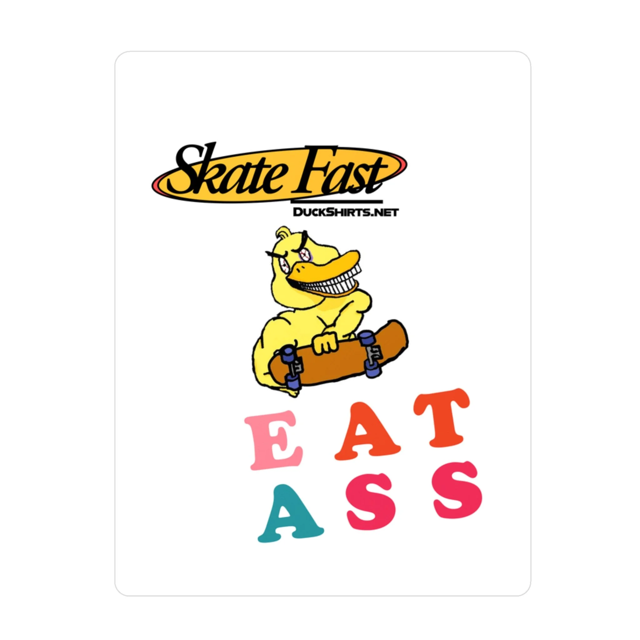 Great for traffic signs, dive bar bathrooms, municipal buildings, or police cruisers! These kiss-cut stickers come on white vinyl with a satin finish that softens glare while keeping colors punchy — the yellow duck and multicolored lettering hold their look outdoors thanks to water-, scratch-, and UV-resistant printing built to last up to three years. The thin 1/8" white border frames each design cleanly and the removable adhesive peels away without leaving residue, so you can move them from skateboards to water bottles, windows, or notebooks. Note: very fine details closer than 0.3" may merge, and lighter color areas can show a slight grain from the printing process. Assembled in the USA from globally sourced parts.